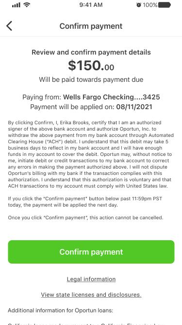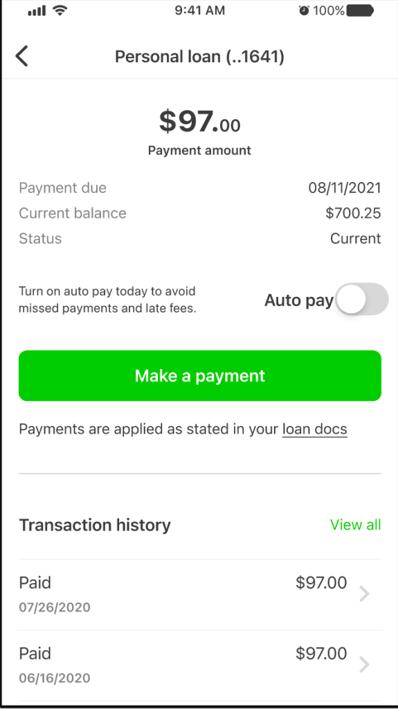 Below, making a standard loan payment in the beta app.